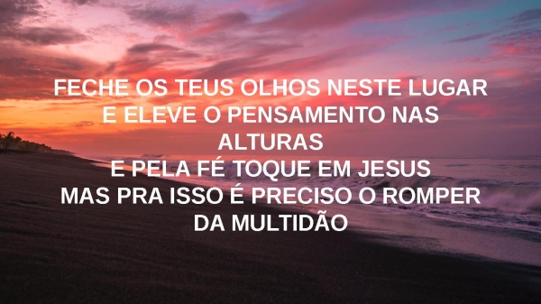 - FECHE OS TEUS OLHOS NESTE LUGARE ELEVE O PENSAMENTO NAS ALTURASE PELA FÉ TOQUE EM JESUSMAS PRA ISSO É PRECISO O ROMPER DA MULTIDÃO