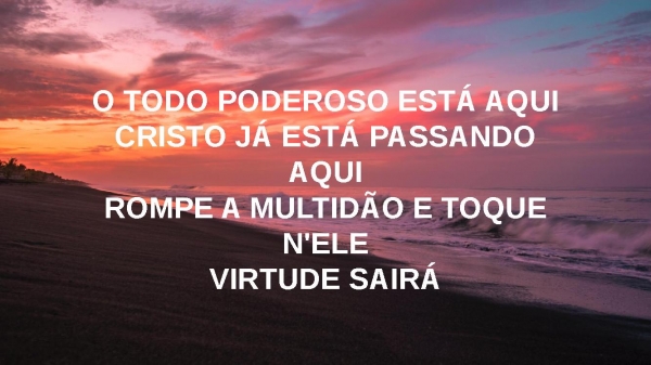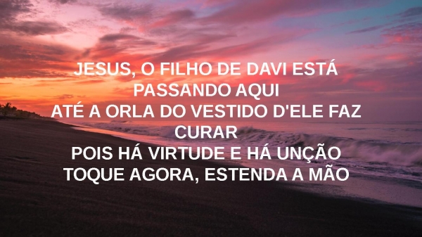 - JESUS, O FILHO DE DAVI ESTÁ PASSANDO AQUIATÉ A ORLA DO VESTIDO D'ELE FAZ CURARPOIS HÁ VIRTUDE E HÁ UNÇÃOTOQUE AGORA, ESTENDA A MÃO