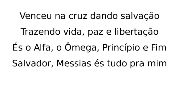 - Venceu na cruz dando salvaçãoTrazendo vida, paz e libertaçãoÉs o Alfa, o Ômega, Princípio e FimSalvador, Messias és tudo pra mim