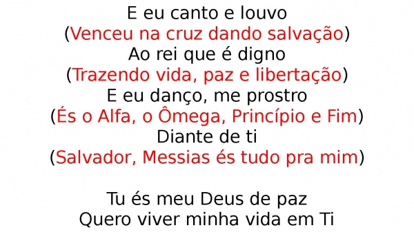 - E eu canto e louvo(Venceu na cruz dando salvação)Ao rei que é digno(Trazendo vida, paz e libertação)E eu danço, me prostro(És o Alfa, o Ômega, Princípio e Fim)Diante de ti(Salvador, Messias és tudo pra mim)Tu és meu Deus de pazQuero viver minha vida em Ti