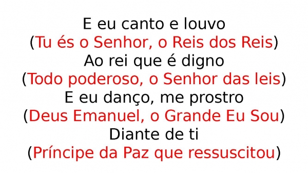 - E eu canto e louvo(Tu és o Senhor, o Reis dos Reis)Ao rei que é digno(Todo poderoso, o Senhor das leis)E eu danço, me prostro(Deus Emanuel, o Grande Eu Sou)Diante de ti(Príncipe da Paz que ressuscitou)