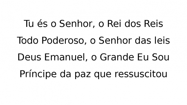 - Tu és o Senhor, o Rei dos ReisTodo Poderoso, o Senhor das leisDeus Emanuel, o Grande Eu SouPríncipe da paz que ressuscitou