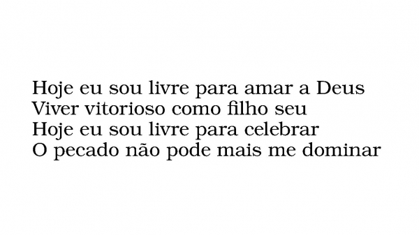 - Hoje eu sou livre para amar a DeusViver vitorioso como filho seuHoje eu sou livre para celebrarO pecado não pode mais me dominar