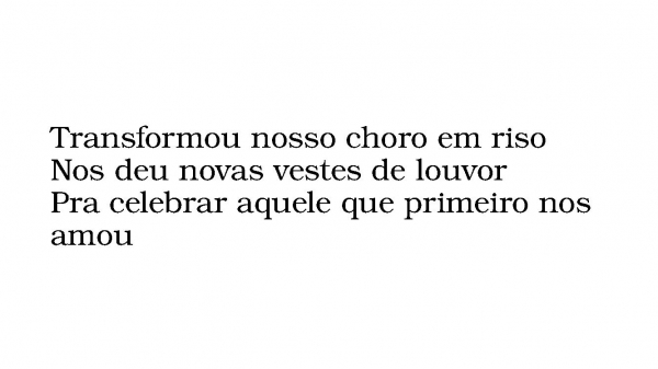 - Transformou nosso choro em risoNos deu novas vestes de louvorPra celebrar aquele que primeiro nos amou