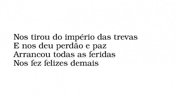 - Nos tirou do império das trevasE nos deu perdão e pazArrancou todas as feridasNos fez felizes demais