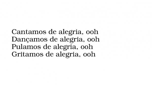 - Cantamos de alegria, oohDançamos de alegria, oohPulamos de alegria, oohGritamos de alegria, ooh