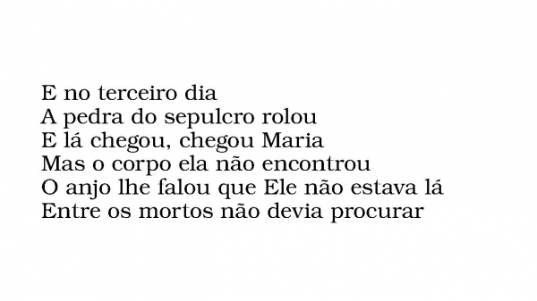 - E no terceiro diaA pedra do sepulcro rolouE lá chegou, chegou MariaMas o corpo ela não encontrouO anjo lhe falou que Ele não estava láEntre os mortos não devia procurar