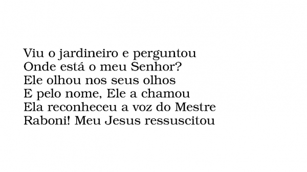 - Viu o jardineiro e perguntouOnde está o meu Senhor?Ele olhou nos seus olhosE pelo nome, Ele a chamouEla reconheceu a voz do MestreRaboni! Meu Jesus ressuscitou