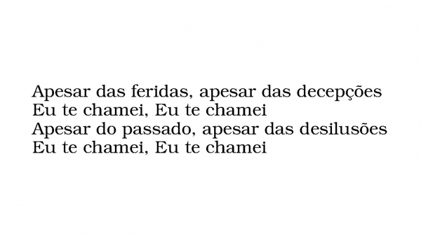 - Apesar das feridas, apesar das decepçõesEu te chamei, Eu te chameiApesar do passado, apesar das desilusõesEu te chamei, Eu te chamei