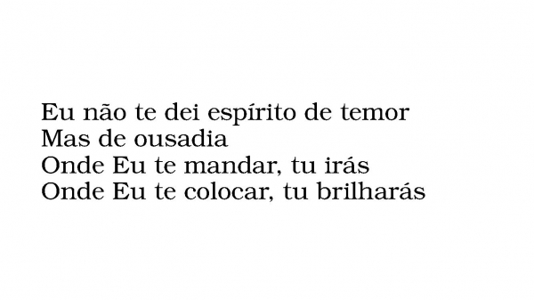 - Eu não te dei espírito de temorMas de ousadiaOnde Eu te mandar, tu irásOnde Eu te colocar, tu brilharás