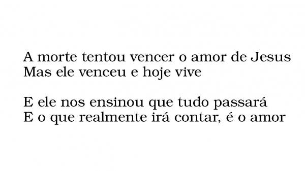 - A morte tentou vencer o amor de JesusMas ele venceu e hoje viveE ele nos ensinou que tudo passaráE o que realmente irá contar, é o amor