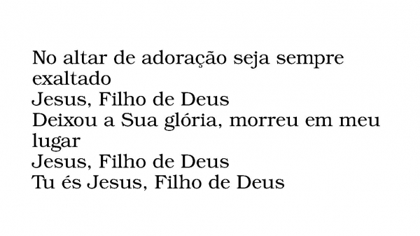 - No altar de adoração seja sempre exaltadoJesus, Filho de DeusDeixou a Sua glória, morreu em meu lugarJesus, Filho de DeusTu és Jesus, Filho de Deus