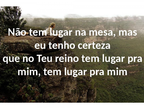 - Não tem lugar na mesa, mas eu tenho certezaque no Teu reino tem lugar pra mim, tem lugar pra mim