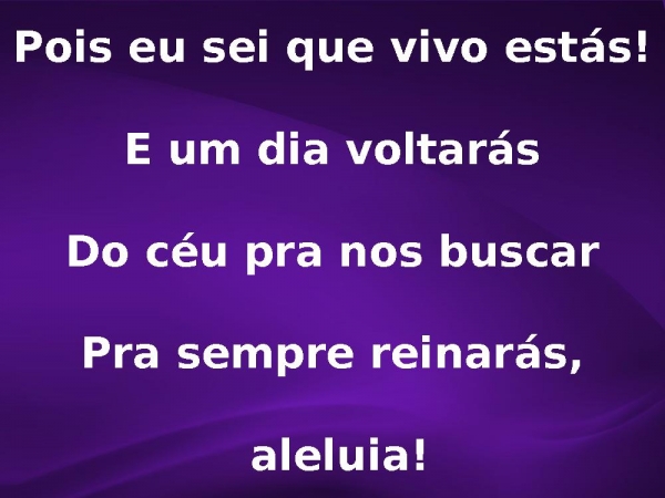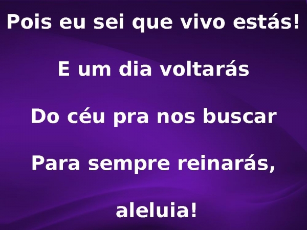 - Pois eu sei que vivo estás!E um dia voltarásDo céu pra nos buscarPara sempre reinarás, aleluia!