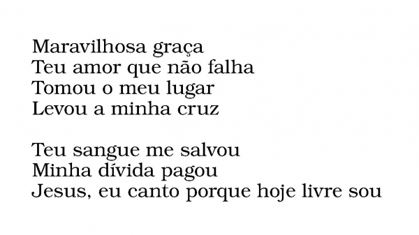 - Maravilhosa graçaTeu amor que não falhaTomou o meu lugarLevou a minha cruzTeu sangue me salvouMinha dívida pagouJesus, eu canto porque hoje livre sou