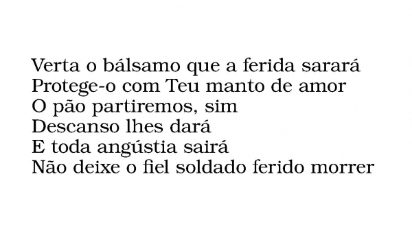 - Verta o bálsamo que a ferida sararáProtege-o com Teu manto de amorO pão partiremos, simDescanso lhes daráE toda angústia sairáNão deixe o fiel soldado ferido morrer