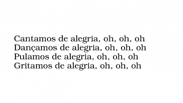 - Cantamos de alegria, oh, oh, ohDançamos de alegria, oh, oh, ohPulamos de alegria, oh, oh, ohGritamos de alegria, oh, oh, oh