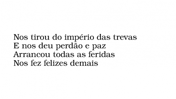 - Nos tirou do império das trevasE nos deu perdão e pazArrancou todas as feridasNos fez felizes demais