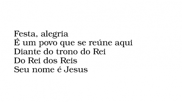 - Festa, alegriaÉ um povo que se reúne aquiDiante do trono do ReiDo Rei dos ReisSeu nome é Jesus