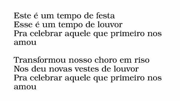 - Este é um tempo de festaEsse é um tempo de louvorPra celebrar aquele que primeiro nos amouTransformou nosso choro em risoNos deu novas vestes de louvorPra celebrar aquele que primeiro nos amou