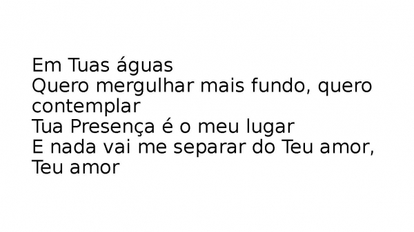 - Em Tuas águasQuero mergulhar mais fundo, quero contemplarTua Presença é o meu lugarE nada vai me separar do Teu amor, Teu amor