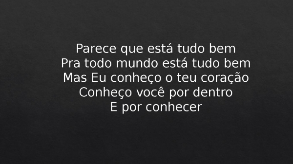 - Parece que está tudo bemPra todo mundo está tudo bemMas Eu conheço o teu coraçãoConheço você por dentroE por conhecer
