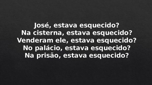 - José, estava esquecido?Na cisterna, estava esquecido?Venderam ele, estava esquecido?No palácio, estava esquecido?Na prisão, estava esquecido?
