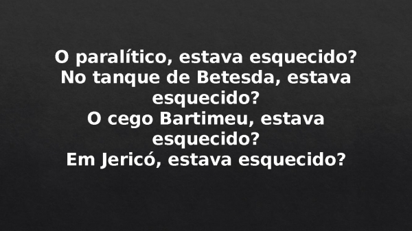 - O paralítico, estava esquecido?No tanque de Betesda, estava esquecido?O cego Bartimeu, estava esquecido?Em Jericó, estava esquecido?