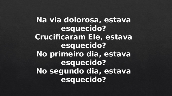 - Na via dolorosa, estava esquecido?Crucificaram Ele, estava esquecido?No primeiro dia, estava esquecido?No segundo dia, estava esquecido?