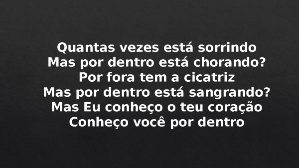 - Quantas vezes está sorrindoMas por dentro está chorando?Por fora tem a cicatrizMas por dentro está sangrando?Mas Eu conheço o teu coraçãoConheço você por dentro
