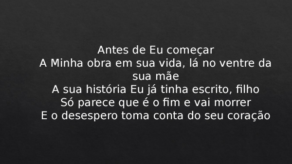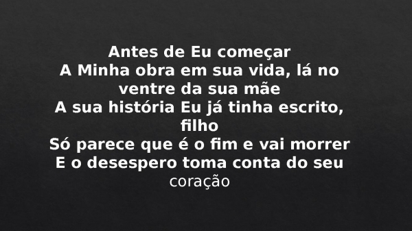 - Antes de Eu começarA Minha obra em sua vida, lá no ventre da sua mãeA sua história Eu já tinha escrito, filhoSó parece que é o fim e vai morrerE o desespero toma conta do seu coração