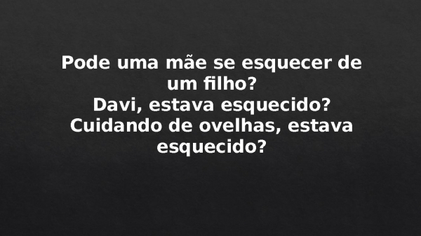 - Pode uma mãe se esquecer de um filho?Davi, estava esquecido?Cuidando de ovelhas, estava esquecido?