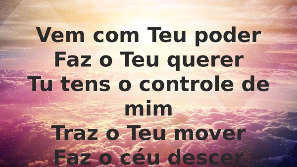- Vem com Teu poderFaz o Teu quererTu tens o controle de mimTraz o Teu moverFaz o céu descer