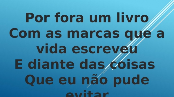 - Por fora um livroCom as marcas que a vida escreveuE diante das coisas Que eu não pude evitarEu encontrei abrigo até tudo passar