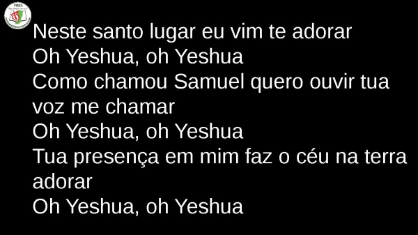 - Neste santo lugar eu vim te adorarOh Yeshua, oh YeshuaComo chamou Samuel quero ouvir tua voz me chamarOh Yeshua, oh YeshuaTua presença em mim faz o céu na terra adorarOh Yeshua, oh Yeshua