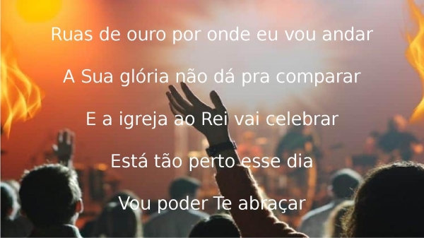 - Ruas de ouro por onde eu vou andarA Sua glória não dá pra compararE a igreja ao Rei vai celebrarEstá tão perto esse diaVou poder Te abraçar