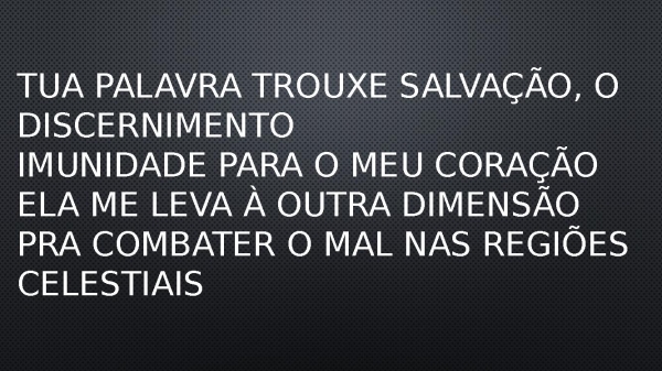 - Tua palavra trouxe salvação, o discernimentoImunidade para o meu coraçãoEla me leva à outra dimensãoPra combater o mal nas regiões celestiais
