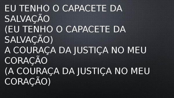 - Eu tenho o capacete da salvação(Eu tenho o capacete da salvação)A couraça da justiça no meu coração(A couraça da justiça no meu coração)