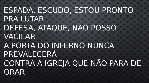 - Espada, escudo, estou pronto pra lutarDefesa, ataque, não posso vacilarA porta do inferno nunca prevaleceráContra a igreja que não para de orar