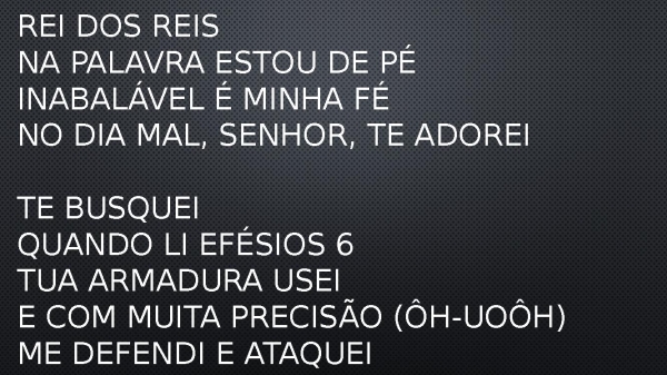 - Rei dos reisNa palavra estou de péInabalável é minha féNo dia mal, senhor, te adoreiTe busqueiQuando li Efésios 6Tua armadura useiE com muita precisão (ôh-uoôh)Me defendi e ataquei