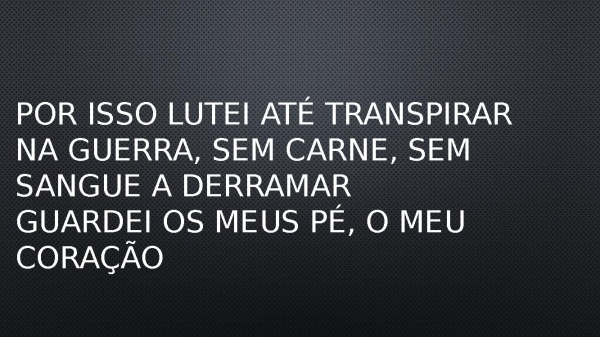 - Por isso lutei até transpirarNa guerra, sem carne, sem sangue a derramarGuardei os meus pé, o meu coração