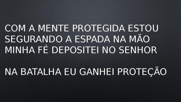 - Com a mente protegida estouSegurando a espada na mãoMinha fé depositei no senhorNa batalha eu ganhei proteção