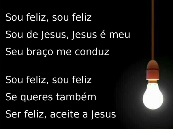 - Sou feliz, sou felizSou de Jesus, Jesus é meuSeu braço me conduzSou feliz, sou felizSe queres tambémSer feliz, aceite a Jesus