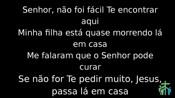 - Senhor, não foi fácil Te encontrar aquiMinha filha está quase morrendo lá em casaMe falaram que o Senhor pode curarSe não for Te pedir muito, Jesus, passa lá em casa
