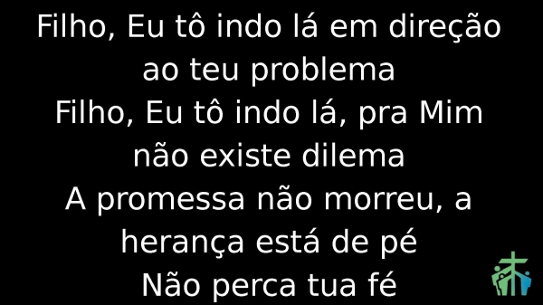 - Filho, Eu tô indo lá em direção ao teu problemaFilho, Eu tô indo lá, pra Mim não existe dilemaA promessa não morreu, a herança está de péNão perca tua fé