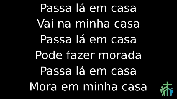 - Passa lá em casaVai na minha casaPassa lá em casaPode fazer moradaPassa lá em casaMora em minha casaComposição de Gileadi InácioColaboração e revisão: Compartilhar no Facebook Compartilhar no Twitter8.525 exibiçõesAuto rolagemTextoRestaurarCorrigir letraImprimirCifra Club Pro