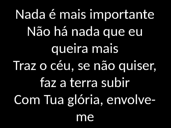 - Nada é mais importanteNão há nada que eu queira maisTraz o céu, se não quiser, faz a terra subirCom Tua glória, envolve-me