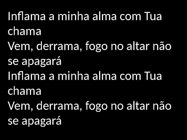 - Inflama a minha alma com Tua chamaVem, derrama, fogo no altar não se apagaráInflama a minha alma com Tua chamaVem, derrama, fogo no altar não se apagará