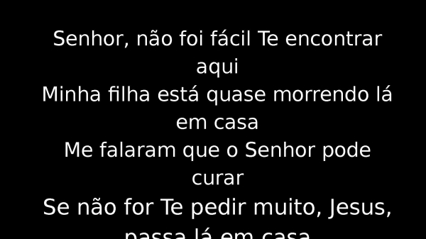 - Senhor, não foi fácil Te encontrar aquiMinha filha está quase morrendo lá em casaMe falaram que o Senhor pode curarSe não for Te pedir muito, Jesus, passa lá em casa