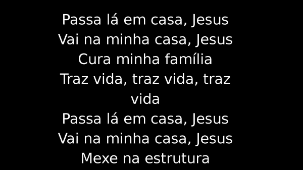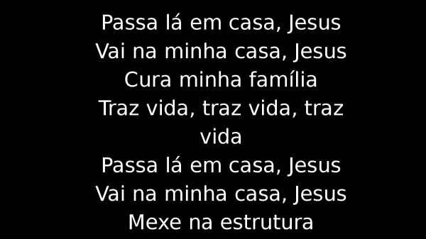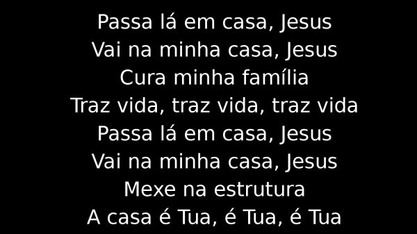- Passa lá em casa, JesusVai na minha casa, JesusCura minha famíliaTraz vida, traz vida, traz vidaPassa lá em casa, JesusVai na minha casa, JesusMexe na estruturaA casa é Tua, é Tua, é Tua